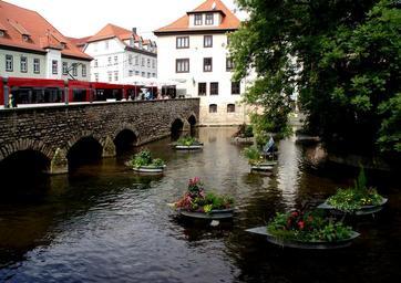 Keywords: water mirroring river flowers in water old town