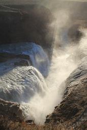 Keywords: water waterfall gorge canyon spray light sun shadow back light fog deep high ice cold winter river flow water level rock movement iceland