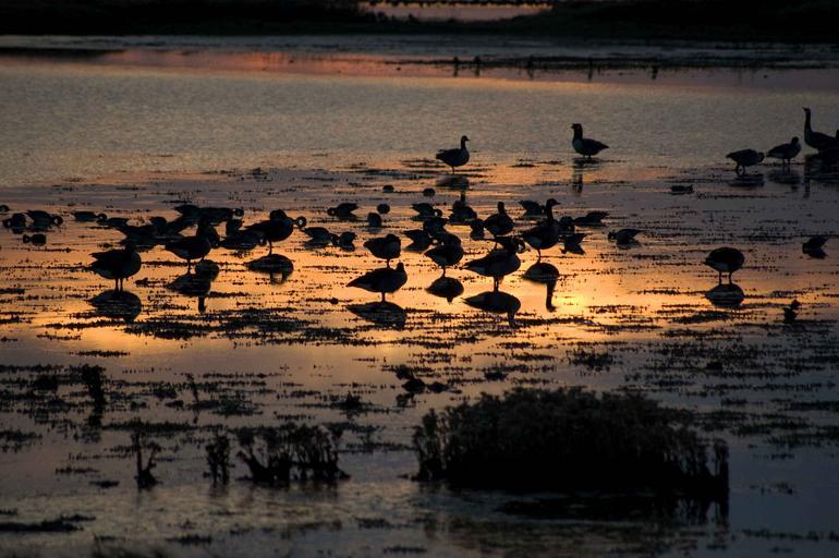 Keywords: waterbirds sunset birds wildlife lake twilight water tranquil peaceful