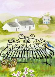 Keywords: watercolor composition field bench flowers grass houses farm house pot farm cottage landscape garden nature summer bright meadow vibrant design