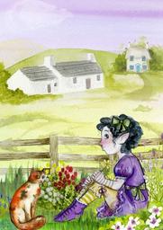 Keywords: watercolor composition girl little sweet cat sitting fence purple dress field flowers grass house farm house pot farm cottage landscape garden nature summer bright meadow vibrant design