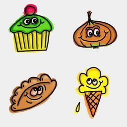 Keywords: watercolor watercolour paint ink objects doodles cartoons food snacks sweet cupcake onion pasty pastry ice cream