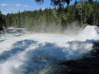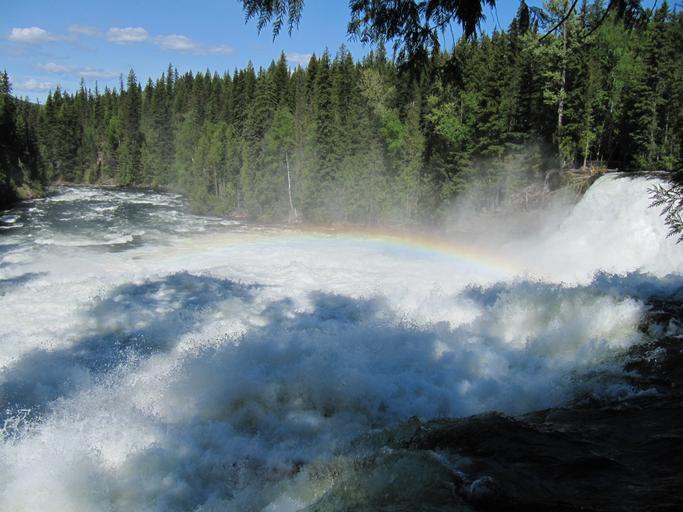 Keywords: waterfall rainbow nature pine trees canada green blue