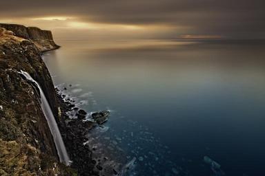 Keywords: waterfall scotland isle of skye lake sky sunset landscape sea nature mood charming romantic atmospheric idyllic dusk distant view hdr water blue red clouded sky beautiful coast mountain