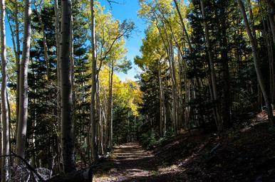 | Keywords: abineau-bear jaw loop abineaubearjawloop arizona coconino national forest coconinonationalforest fr 146 fr146 flagstaff ranger district flagstaffrangerdistrict forest road 146 forestroad146 forest service forestservice kachina peaks wilderness kachinapeakswilderness san francisco mountain sanfranciscomountain san francisco peaks sanfranciscopeaks usfs waterline road waterlineroad waterline trail waterlinetrail waterline trail #146 waterlinetrail146 waterline trail no. 146 waterlinetrailno146 aspen aspens fall color fallcolor fall colors fallcolors fall foliage fallfoliage flagstaff forest hiking mountain outdoors peaks trail wilderness outdoor landscape tree plant Abineau Trail is a steep 1,800 foot climb over two miles up the slopes of the San Francisco Peaks through Abineau Canyon. The trail meets the Waterline Trail at the top, which can be followed down to Bear Jaw Trail to return to the trailhead. Each leg of the loop is around two miles long, plus a 0.4 mile connector trail from the trailhead to the loop, making a total loop hike of seven miles. The loop is one of the quintessential autumn hikes in the San Francisco Peaks. Aspens along all three legs of the loop turn gold, and falling leaves carpet the forest floor and decorate the conifers. A storm system passed through the area October 4-7, 2015, raining at lower elevations and snowing on the upper reaches of the San Francisco Peaks. The snow-capped Peaks were a wonderful treat after the few days grey, cloudy, wet weather that had put a damper on outdoor activity. Photo by Deborah Lee Soltesz, October 8, 2015. Credit: U.S. Forest Service, Coconino National Forest. For more information about this trail, see the Abineau-Bear Jaw Loop trail description on the Coconino National Forest website. Abineau Trail is a steep 1,800 foot climb over two miles up the slopes of the San Francisco Peaks through Abineau Canyon. The trail meets the Waterline Trail at the top, which can be followed down to Bear Jaw Trail to return to the trailhead. Each leg of the loop is around two miles long, plus a 0.4 mile connector trail from the trailhead to the loop, making a total loop hike of seven miles. The loop is one of the quintessential autumn hikes in the San Francisco Peaks. Aspens along all three legs of the loop turn gold, and falling leaves carpet the forest floor and decorate the conifers. A storm system passed through the area October 4-7, 2015, raining at lower elevations and snowing on the upper reaches of the San Francisco Peaks. The snow-capped Peaks were a wonderful treat after the few days grey, cloudy, wet weather that had put a damper on outdoor activity. Photo by Deborah Lee Soltesz, October 8, 2015. Credit: U.S. Forest Service, Coconino National Forest. For more information about this trail, see the Abineau-Bear Jaw Loop trail description on the Coconino National Forest website. |