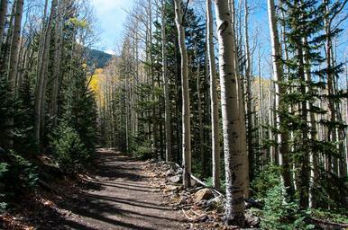 | Keywords: abineau-bear jaw loop abineaubearjawloop arizona coconino national forest coconinonationalforest fr 146 fr146 flagstaff ranger district flagstaffrangerdistrict forest road 146 forestroad146 forest service forestservice kachina peaks wilderness kachinapeakswilderness san francisco mountain sanfranciscomountain san francisco peaks sanfranciscopeaks usfs waterline road waterlineroad waterline trail waterlinetrail waterline trail #146 waterlinetrail146 waterline trail no. 146 waterlinetrailno146 aspen aspens fall color fallcolor fall colors fallcolors fall foliage fallfoliage flagstaff forest hiking mountain outdoors peaks trail wilderness outdoor landscape tree plant Abineau Trail is a steep 1,800 foot climb over two miles up the slopes of the San Francisco Peaks through Abineau Canyon. The trail meets the Waterline Trail at the top, which can be followed down to Bear Jaw Trail to return to the trailhead. Each leg of the loop is around two miles long, plus a 0.4 mile connector trail from the trailhead to the loop, making a total loop hike of seven miles. The loop is one of the quintessential autumn hikes in the San Francisco Peaks. Aspens along all three legs of the loop turn gold, and falling leaves carpet the forest floor and decorate the conifers. A storm system passed through the area October 4-7, 2015, raining at lower elevations and snowing on the upper reaches of the San Francisco Peaks. The snow-capped Peaks were a wonderful treat after the few days grey, cloudy, wet weather that had put a damper on outdoor activity. Photo by Deborah Lee Soltesz, October 8, 2015. Credit: U.S. Forest Service, Coconino National Forest. For more information about this trail, see the Abineau-Bear Jaw Loop trail description on the Coconino National Forest website. Abineau Trail is a steep 1,800 foot climb over two miles up the slopes of the San Francisco Peaks through Abineau Canyon. The trail meets the Waterline Trail at the top, which can be followed down to Bear Jaw Trail to return to the trailhead. Each leg of the loop is around two miles long, plus a 0.4 mile connector trail from the trailhead to the loop, making a total loop hike of seven miles. The loop is one of the quintessential autumn hikes in the San Francisco Peaks. Aspens along all three legs of the loop turn gold, and falling leaves carpet the forest floor and decorate the conifers. A storm system passed through the area October 4-7, 2015, raining at lower elevations and snowing on the upper reaches of the San Francisco Peaks. The snow-capped Peaks were a wonderful treat after the few days grey, cloudy, wet weather that had put a damper on outdoor activity. Photo by Deborah Lee Soltesz, October 8, 2015. Credit: U.S. Forest Service, Coconino National Forest. For more information about this trail, see the Abineau-Bear Jaw Loop trail description on the Coconino National Forest website. |