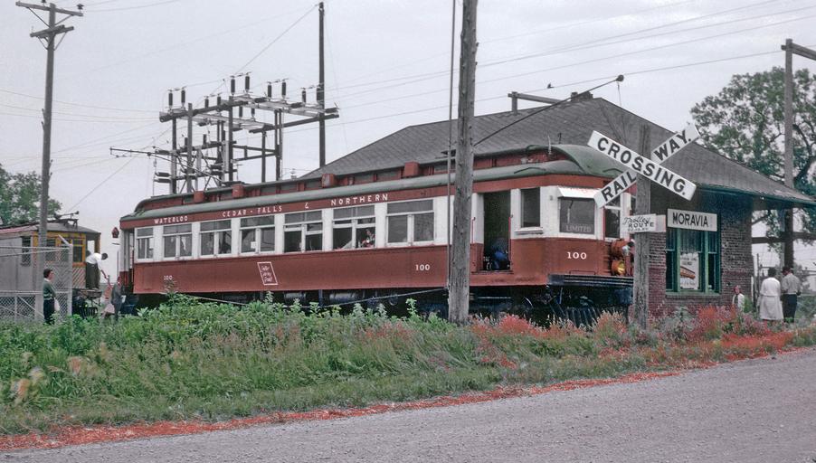In this photo WCF&N 100 had just arrived at the Monrovia, IA station of the Southern Iowa Ry. Note Cross bucks in foreground; freight motor, and substation to left. Waterloo, Cedar Falls, and Northern Ry Car 100 - 10 Photos (27035789875).jpg en Roger Puta with his camera was in Iowa the weekend of June 22 and 23 1963 The Iowa Chapter of the NRHS was throwing a multi electric car event <br> In this photo WCF N 100 had just arrived at the Monrovia IA station of the Southern Iowa Ry Note Cross bucks in foreground; freight motor and substation to left 2016-05-15 13 21 37 https //www flickr com/people/129679309 N05 railfan 44 https //www flickr com/photos/129679309 N05/27035789875/ User Fæ/Flickr API Puta's Rwy Museums Photos Puta's Rail Mass Transit Photographs Period Photographs of Transportation pre-1980 Trams/Streetcars Midwest Railroads Railroad Graphics Heralds and Signs Electric Railroad Action Fine Art Photography of Railroading Block Signals Grade Crossings Mel Finzer RogerPuta Photographs by Roger Puta Photos uploaded from Flickr by Fæ using a script 1963 in rail transport in the United States |