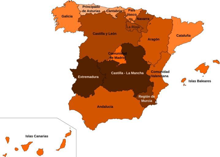 | Keywords: Watts per capita Spain.svg en Photovoltaic capacity in 'watts per capita' by autonomous communities in Spain First version as of the end of 2013 http //www webcitation org/6QGSvAF7w Source data from www epia org Global Market Outlook for Photovoltaics 2014-2018 page 24 PDF-file FFB380 1px solid FF7F2A >1 watt per habitant FF9955 1px solid FF6600 1 ”10 watts per habitant FF7F2A 1px solid D45500 10 ”50 watts per habitant FF6600 1px solid AA4400 50 ”100 watts per habitant D45500 1px solid 803300 100 ”200 watts per habitant AA4400 1px solid 803300 200 ”350 watts per habitant 803300 1px solid 803300 350 ”500 watts per habitant 552200 1px solid 552200 500 ”750 watts per habitant 2B1100 1px solid 2B1100 >750 watts per habitant 2014-06-15 20 35 14 own Valid SVG margin 5px 0; inkscape Rfassbind Cartograms of Europe Cartograms European Photovoltaics |
