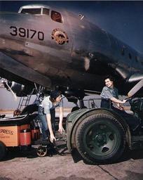 | Keywords: WAVES with R5D-1 at NAS Oakland in 1945.jpg U S Navy Seaman 1st Class Billy Ikard left and Seaman 1st Class Barbara A Patterson move a battery cart into position next to a Naval Air Transport Service Douglas R5D-1 Skymaster BuNo 39170 at Naval Air Station Oakland California USA circa mid-1945 Both WAVES were assigned to Naval Air Transport Squadron Four VR-4 <br> The R5D-1 39170 c/n 10323 was the ex-USAAF C-54A s/n 42-72218 It was sold to Pan American Airways as N88932 Clipper Matchless in 1947 and served until 1951 After a few more owners it became KA-ADJ with the Katanga rebels Kongo in November 1962 Official U S Navy photo http //www history navy mil/photos/images/k05000/k05659c htm 80-G-K-5659 from the U S Navy http //www history navy mil Naval History and Heritage Command ca 1945-06 USN http //www history navy mil/branches/org11-2 htm PD-USGov-Military-Navy Women Accepted for Volunteer Emergency Service Douglas R5D Skymaster Naval Air Station Oakland Pacific War in June 1945 World War II color photographs of the US Homefront |