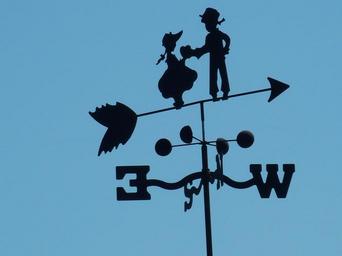 Keywords: weather vane sky blue skies direction blue silhouette design whirly-gig handwork roof black yard metal decorative iron wrought