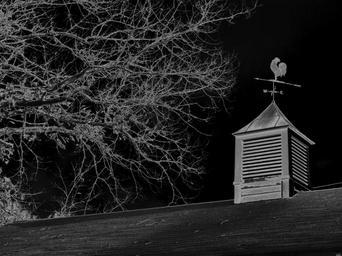 Keywords: weathervane copula barn weather vane rooster wind wind direction weathercock wind direction indicator wind vane whirly-gig trees black black and white winter bare dead fall tree branches branch marrowbone kentucky halloween
