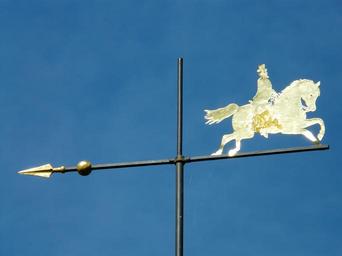 Keywords: weathervane metal gold sparkle reiter horse sky tab read chapel wind direction sensor wind vane cross