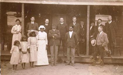 | Keywords: katanning western australia westernaustralia aboriginal reserve aboriginalreserve vintage perth a lock alock missionary bride groom wedding seamstress Written on reverse: "This is the first wedding that took place on the new native settlement. The bride was very clever at sewing. She made over 60 new garments and her wedding clothes, also her dress. We miss her very much from the home. Give my love to your mother and sister. Wishing you all a very bright and happy Christmas and prosperous New Year. Love from A. Lock" Miss Lock was the missionary to the aborigines in the district and that could be her standing at the back on the left. Written on reverse: "This is the first wedding that took place on the new native settlement. The bride was very clever at sewing. She made over 60 new garments and her wedding clothes, also her dress. We miss her very much from the home. Give my love to your mother and sister. Wishing you all a very bright and happy Christmas and prosperous New Year. Love from A. Lock" Miss Lock was the missionary to the aborigines in the district and that could be her standing at the back on the left. |