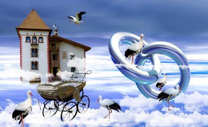 Keywords: wedding children young stork sky castle baby carriage wedding rings rings clouds luck happy baby fly above the clouds children's day forward pipe dream dream image overlay house construction greeting card greeting marriage marry baptism