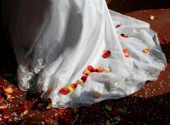 Keywords: wedding dress wedding dress train luxurious soft white delicate lace folds light rose petals terracotta floor confetti romantic sentimental