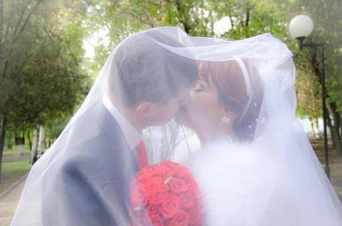 Keywords: wedding kiss the groom bride stroll just married dress happiness beauty green leaves outdoors sweethearts mood couple future love fata