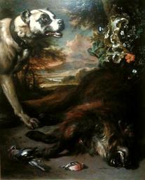| Keywords: Weenix A dog over a dead boar.jpg Artwork Creator Jan Weenix 1705 Oil on canvas cm 170 99 Institution National Museum Warsaw accession number M Ob 2501 127180 object history credit line ProvenanceEvent 1939 purchase National Museum Warsaw J Sachs J Weenix f / 1705 signature/date Jan Białostocki Michał Walicki 1955 Malarstwo europejskie w zbiorach polskich 1300-1800 PIW p 531 own BurgererSF See below PD-old-100 DEFAULTSORT 1705; A dog over a dead boar Jan Weenix Dutch paintings in the National Museum in Warsaw 18th-century paintings in the National Museum in Warsaw 1705 oil on canvas paintings 18th-century paintings of dogs 18th-century still life paintings of dead game Paintings of boars Still life paintings with dogs |