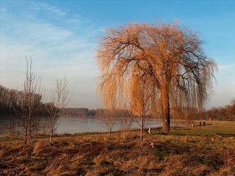 Keywords: Weeping Willow tree lake autumn Rhine river Germany