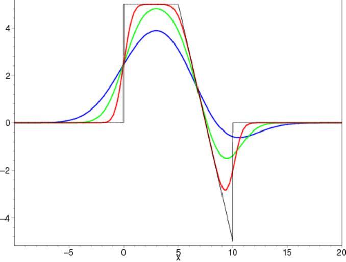 | Keywords: Weierstrass.png Weierstrass transforms for t 0 2 red t 1 green and t 3 blue The standard Weierstrass transfrom F x is the case t 1 the green graph Own AxelBoldt 2008-05 File was created with the following Maple 6 code <pre> > W f t x -> 1/sqrt 4 t Pi int f x-y exp -y 2/4/t y -infinity infinity ; > f x-> piecewise x<0 or x>10 0 x<5 5 5-2 x-5 ; > plotsetup ps plotoutput `weierstrass ps` plotoptions `width 8in height 6in portrait color noborder` ; > plot f x W f 0 2 x W f 1 x W f 3 x x -10 20 axes boxed color black red green blue thickness 2 3 3 3 ; </pre> and then converted from Postscript to PNG using GraphicsMagic Integral calculus Images with Maple source code |