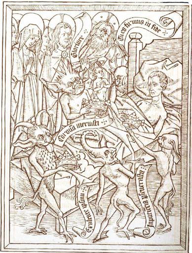 Keywords: Weigel 07.JPG Artist Gloriare Tu es firmus in fide Coronam meruisti Exalta teipsum In paciencia perseuerasta perseverasti ---- Schriftbänder Sei stolz Du bist stark im Glauben Du hast die Krone verdient Verherrliche dich selbst Du bist in Geduld geübt ---- Banderoles Be proud You are strong in faith You have earned the crown Exalt yourself Persevere in patience Five devils adulate sanctimoniously and offer crowns Mary Christ and God the Father attend the dying man along with saints Three small figures of saved souls at his eye level show that pride can be resisted own PD-old Other versions left thumb Ars moriendi |