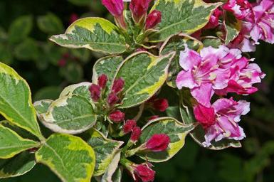Keywords: weigela bush flowering shrub bi color garden flower bed pink flowering pink blossom bloom hedge flowering hedge garden design bud flower plant spring nature branch leaves bicolor leaves leaf green leaf structure pattern