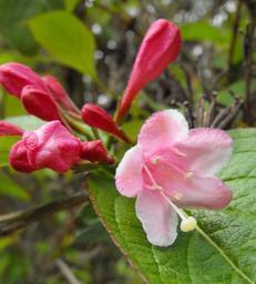 Keywords: Weigelahortensis.jpg en Weigela hortensis at the UC Berkeley Botanical Garden California USA Identified by sign own Stickpen 2010-03-31 public domain Weigela × hybrida