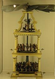 | Keywords: Weihnachtspyramide aus Schönheide im Erzgebirge.jpg en Old Christmas pyramid from about 1830 - first half of the 19 century From Germany Ore Mountains Ore Mountain folk art crafted at Schoenheide in the Ore Mountains Now to be seen in the Brush- and Regional Museum at Schoenheide/Saxony de Weihnachtspyramide aus Schönheide im Erzgebirge ausgestellt im Schönheider Bürsten- und Heimatmuseum - Text der Beschriftung im Museum um 1830 gehört zu den ältesten erhaltenen Pyramiden des Erzgebirges Ca 60 geschnitzte Figuren Erste Etage Bergaufzug und Handwerker Zweite Etage Darstellung der biblischen Weihnachtsgeschichte Maria und Josef auf der Flucht nach Ägypten Engel Soldaten Schriftgelehrter ¦ 3 Etage Paradiesgärtlein mit Adam und Eva Baum mit Schlange exotischen Tieren Der 24 Dezember galt lange Zeit als Adam-und-Eva-Tag žDer klassische Drehturm aus Schönheide mit seiner Barockbekrönung mag auf die Zeit um 1830 zurückgehen Adolf Spamer Deutsche Volkskunst Sachsen Weimar 1954 žÃ„lteste geschnitzte Figuren des Bergaufzugs sind auf Pyramiden aus der ersten Hälfte des vergangenen Jahrhunderts gemeint ist das 19 Jahrhundert erhalten Claus Leichsenring Erzgebirgische Weihnachtspyramiden Dresden 1993 Seite 51 unter Hinweis auf die Abbildung der Schönheider Pyramide in dieser Veröffentlichung auf Seite 44 own Klaaschwotzer 2013-12-01 Christmas pyramids in Germany Ore Mountain folk art Cc-zero |