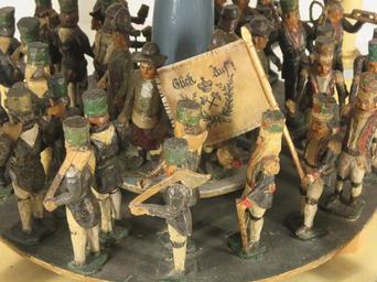 | Keywords: Weihnachtspyramide Christmas pyramid from about 1830 2.JPG en Old Christmas pyramid from about 1830 - first half of the 19 century This is the bottom of the pyramid Parade of miners of the Ore Mountains in their special uniforms for parades The wish Glück auf means the hope to come back home safely from the underground mining - From Germany Ore Mountains Ore Mountain folk art crafted at Schoenheide in the Ore Mountains Now to be seen in the Brush- and Regional Museum at Schoenheide/Saxony de Weihnachtspyramide aus Schönheide im Erzgebirge ausgestellt im Schönheider Bürsten- und Heimatmuseum “ Untere Etage mit Parade von Bergleuten in Paradeuniform Bergaufzug - Text der Beschriftung im Museum um 1830 gehört zu den ältesten erhaltenen Pyramiden des Erzgebirges Ca 60 geschnitzte Figuren Erste Etage Bergaufzug und Handwerker Zweite Etage Darstellung der biblischen Weihnachtsgeschichte Maria und Josef auf der Flucht nach Ägypten Engel Soldaten Schriftgelehrter ¦ 3 Etage Paradiesgärtlein mit Adam und Eva Baum mit Schlange exotischen Tieren Der 24 Dezember galt lange Zeit als Adam-und-Eva-Tag žDer klassische Drehturm aus Schönheide mit seiner Barockbekrönung mag auf die Zeit um 1830 zurückgehen Adolf Spamer Deutsche Volkskunst Sachsen Weimar 1954 žÃ„lteste geschnitzte Figuren des Bergaufzugs sind auf Pyramiden aus der ersten Hälfte des vergangenen Jahrhunderts gemeint ist das 19 Jahrhundert erhalten Claus Leichsenring Erzgebirgische Weihnachtspyramiden Dresden 1993 Seite 51 unter Hinweis auf die Abbildung der Schönheider Pyramide in dieser Veröffentlichung auf Seite 44 own Klaaschwotzer 2013-12-01 Christmas pyramids in Germany Ore Mountain folk art Christmas pyramid from about 1830 Cc-zero |