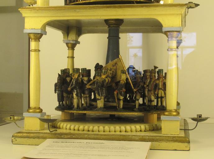 | Keywords: Weihnachtspyramide Christmas pyramid from about 1830 5.jpg en Old Christmas pyramid from about 1830 - first half of the 19 century to be seen in the neo-classical architecture This is the lowermost part of the pyramid Parade of miners of the Ore Mountains in their special uniforms for parades The wish Glück auf good luck back means the hope to come back home safely from the underground mining The figures have a size of about 15 to 18 centimetre - From Germany Ore Mountains Ore Mountain folk art crafted at Schoenheide in the Ore Mountains Now to be seen in the Brush- and Regional Museum at Schoenheide/Saxony de Weihnachtspyramide aus Schönheide im Erzgebirge ausgestellt im Schönheider Bürsten- und Heimatmuseum “ Unterste Etage mit einer Bergparade Bergaufzug Bergleute in Paradeuniform Text der Beschriftung im Museum um 1830 gehört zu den ältesten erhaltenen Pyramiden des Erzgebirges Ca 60 geschnitzte Figuren Erste Etage Bergaufzug und Handwerker Zweite Etage Darstellung der biblischen Weihnachtsgeschichte Maria und Josef auf der Flucht nach Ägypten Engel Soldaten Schriftgelehrter ¦ 3 Etage Paradiesgärtlein mit Adam und Eva Baum mit Schlange exotischen Tieren Der 24 Dezember galt lange Zeit als Adam-und-Eva-Tag žDer klassische Drehturm aus Schönheide mit seiner Barockbekrönung mag auf die Zeit um 1830 zurückgehen Adolf Spamer Deutsche Volkskunst Sachsen Weimar 1954 žÃ„lteste geschnitzte Figuren des Bergaufzugs sind auf Pyramiden aus der ersten Hälfte des vergangenen Jahrhunderts gemeint ist das 19 Jahrhundert erhalten Claus Leichsenring Erzgebirgische Weihnachtspyramiden Dresden 1993 Seite 51 unter Hinweis auf die Abbildung der Schönheider Pyramide in dieser Veröffentlichung auf Seite 44 own Klaaschwotzer Christmas pyramids in Germany Ore Mountain folk art Christmas pyramid from about 1830 Cc-zero |