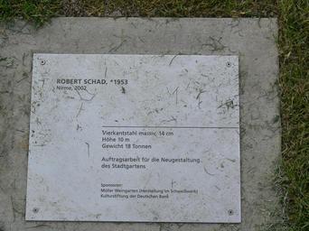 Keywords: Weingarten Stadtgarten Schad Tafel.jpg Weingarten Württemberg Stadtgarten<br /> Tafel bei der Skulptur žNirme von Robert Schad 2002 own 2008-09 Photo Andreas Praefcke Nirme Schad