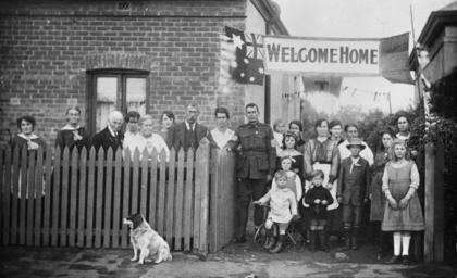 | Keywords: australian war memorial australianwarmemorial blackandwhite monochrome black and white ID number: P05328.001 Photographer: Unknown Date Made: July - August 1919 Adelaide, South Australia: Group portrait of 540 Sapper Arthur Findon Dunbar MM, 2nd Australian Tunnelling Company (in uniform with his arm resting on gate) and his family members gathered outside their house at 45 Chief Street, Brompton, SA. The gateway has been decorated overhead with a sign that reads 'Welcome Home' and an Australian flag. Among the children in the front rows, a little boy stands beside his tricycle and a brown and white dog sits in front of the fence. A blacksmith prior to enlistment on 29 September 1915, Sapper Dunbar was awarded the Military Medal (MM) in 1918. His citation stated "During the operations against the Hindenburg Line on the morning of 29th September, in the neighbourhood of Bellicourt, he was engaged with a party searching for enemy mines. Sapper Dunbar removed several dangerous booby traps from dugouts and assisted in the capture of many prisoners. He also detected and removed a large number of road mines. The whole of the day he worked under heavy shell and machine gun fire, during which 50 of his party became casualties". Sapper Dunbar returned to Australia in June 1919 and was discharged on 25 August Rights Info: No known copyright restrictions. This photograph is from the Australian War Memorial's collection www.awm.gov.au Persistent URL: www.awm.gov.au/collection/PB05328.001 ID number: P05328.001 Photographer: Unknown Date Made: July - August 1919 Adelaide, South Australia: Group portrait of 540 Sapper Arthur Findon Dunbar MM, 2nd Australian Tunnelling Company (in uniform with his arm resting on gate) and his family members gathered outside their house at 45 Chief Street, Brompton, SA. The gateway has been decorated overhead with a sign that reads 'Welcome Home' and an Australian flag. Among the children in the front rows, a little boy stands beside his tricycle and a brown and white dog sits in front of the fence. A blacksmith prior to enlistment on 29 September 1915, Sapper Dunbar was awarded the Military Medal (MM) in 1918. His citation stated "During the operations against the Hindenburg Line on the morning of 29th September, in the neighbourhood of Bellicourt, he was engaged with a party searching for enemy mines. Sapper Dunbar removed several dangerous booby traps from dugouts and assisted in the capture of many prisoners. He also detected and removed a large number of road mines. The whole of the day he worked under heavy shell and machine gun fire, during which 50 of his party became casualties". Sapper Dunbar returned to Australia in June 1919 and was discharged on 25 August Rights Info: No known copyright restrictions. This photograph is from the Australian War Memorial's collection www.awm.gov.au Persistent URL: www.awm.gov.au/collection/PB05328.001 |