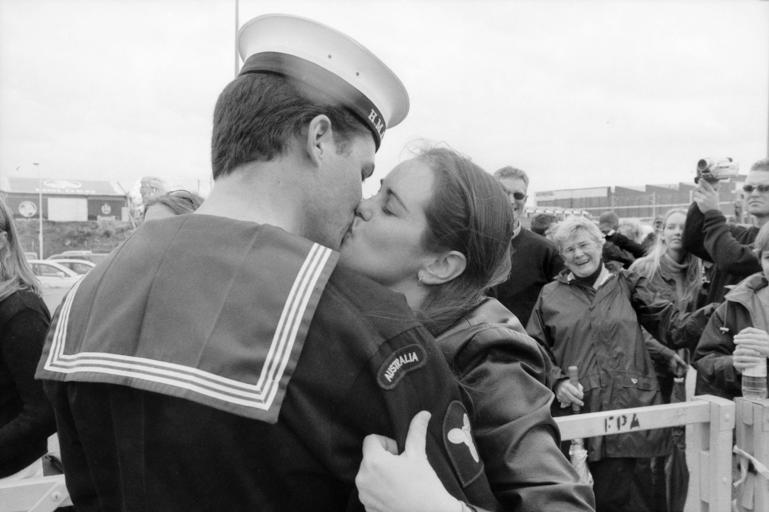 Keywords: australian war memorial australianwarmemorial pork pie hat full rig uniform sailor cap kiss blackandwhite monochrome black and white Fremantle An unidentified marine technician from HMAS Darwin kisses his girlfriend at a homecoming ceremony for HMAS ANZAC and HMAS Darwin at Victoria Quay, Fremantle, WA. HMAS Darwin left Australia for the Persian Gulf on 28 October 2002, under Operation Slipper, Australia’s contribution to the international fight against terrorism, to participate in the Multinational Interception Force enforcing UN sanctions against Iraq. The Darwin was then assigned to Operation Bastille, the build-up of Australian forces against Iraq, in January 2003, and then to Operation Falconer, Australia’s contribution to the war on Iraq, in March 2003. The Task Group to which the Darwin was allocated was responsible for clearing the Khawr Abd Allah waterway. Rights Info: No known copyright restrictions. This photograph is from the Australian War Memorial's collection www.awm.gov.au Persistent URL: cas.awm.gov.au/photograph/P04192.123 Fremantle An unidentified marine technician from HMAS Darwin kisses his girlfriend at a homecoming ceremony for HMAS ANZAC and HMAS Darwin at Victoria Quay, Fremantle, WA. HMAS Darwin left Australia for the Persian Gulf on 28 October 2002, under Operation Slipper, Australia’s contribution to the international fight against terrorism, to participate in the Multinational Interception Force enforcing UN sanctions against Iraq. The Darwin was then assigned to Operation Bastille, the build-up of Australian forces against Iraq, in January 2003, and then to Operation Falconer, Australia’s contribution to the war on Iraq, in March 2003. The Task Group to which the Darwin was allocated was responsible for clearing the Khawr Abd Allah waterway. Rights Info: No known copyright restrictions. This photograph is from the Australian War Memorial's collection www.awm.gov.au Persistent URL: cas.awm.gov.au/photograph/P04192.123