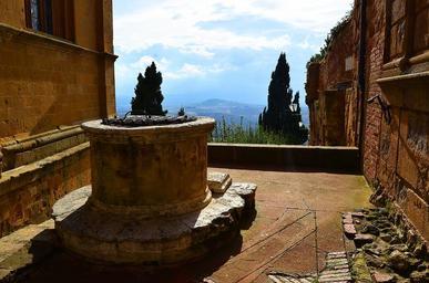Keywords: well city landscape summer heat day stone building italy pienza tuscany tree trees