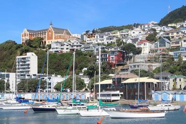 Keywords: wellington new zealand city center port booked water sea holiday ship sun clear coast blue sky sailing vessel sailing boat catamaran