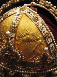 | Keywords: Weltliche Schatzkammer Wien (258b).JPG Rudolf II Ritt auf den Krönungshügel nach seiner Krönung zum König von Ungarn in Preßburg Die Krone Kaiser Rudolfs II ; später Krone des Kaisertums Österreich Jan Vermeyen gest 1606 Prag Prag 1602 Gold teilweise emailliert Edelsteine Perlen Samt H 28 3 cm Kronreif 22 4 cm Durchmesser mit Perlen größte Spannweite über Stirn- und Nackenlilien 27 8 cm SK Inv -Nr XIa 1 Rudolf II ride onto the coronation hill after his coronation as King of Hungary in Bratislava The Crown of Rudolf II later Crown of the Austrian Empire Jan Vermeyen Prague 1602 Gold partially enamelled diamonds rubies spinel rubies sapphire pearls velvet H 28 3 cm circlet 22 4 cm in diameter with pearls largest span over the fleurs-de-lis on the brow and neck 27 8 cm SK Inv No XIa 1 Own 2007-10 MyName Gryffindor Imperial Crown of Austria History of Bratislava Secular and Ecclesiastical Treasury |