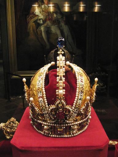 | Keywords: Weltliche Schatzkammer Wien (263).JPG Die Krone Kaiser Rudolfs II ; später Krone des Kaisertums Österreich Jan Vermeyen gest 1606 Prag Prag 1602 Gold teilweise emailliert Edelsteine Perlen Samt H 28 3 cm Kronreif 22 4 cm Durchmesser mit Perlen größte Spannweite über Stirn- und Nackenlilien 27 8 cm SK Inv -Nr XIa 1 The Crown of Rudolf II later Crown of the Austrian Empire Jan Vermeyen Prague 1602 Gold partially enamelled diamonds rubies spinel rubies sapphire pearls velvet H 28 3 cm circlet 22 4 cm in diameter with pearls largest span over the fleurs-de-lis on the brow and neck 27 8 cm SK Inv No XIa 1 Own 2007-10 MyName Gryffindor Painting in the background by Friedrich von Amerling of Emperor Franz I of Austria 100px Imperial Crown of Austria Secular and Ecclesiastical Treasury |