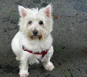 Keywords: west highland white terrier westie terrier dog cute white sitting pet canine animal outdoors photo image portrait breed