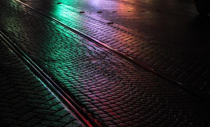 Keywords: wet road railroad street city life asphalt pavement rain