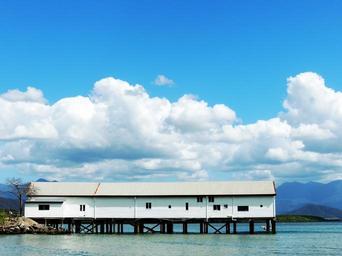 Keywords: wharf building water coast sky blue clouds sea bay landmark