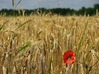 Keywords: wheat field spike wheat cornfield poppy cereals red yellow flower field summer poppy flower grain blossom bloom arable mohngewaechs wild windy wind agriculture sun golden mature gold halme bloom rays light hiding place hide