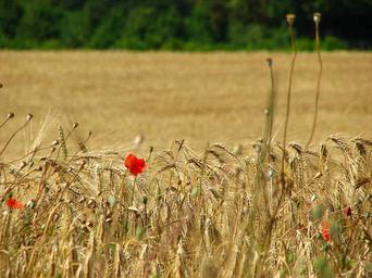 Keywords: wheat field spike wheat cornfield poppy cereals red yellow flower field summer poppy flower grain blossom bloom arable mohngewaechs wild windy wind agriculture sun golden mature gold halme bloom rays light