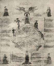 | Keywords: Wheel-of-life-mother-nature-forrer-french-c1400.jpg Ages of Man are shown rising on the left side in youth sitting atop the wheel in maturity and falling on the right in old age Death a skeletal reaper waits at the lower right Mother Nature is at the bottom holding the wheel The word generatio is written by her right hand below the child while corruptio is written by her left hand beneath Death Atop the wheel is Time a winged figure with three faces labeled Past Present and Future Her four wings are the seasons with the months as feathers and her feet are labled Day and Night Flowing from her hands are the sands of time The seven canonical hours are written around the rim of the wheel Prime Terce Sext heure de midy None Vespers Compline Matins Between the eight spokes of the wheel are questions in verse which are answered in the quatrains on either side of the wheel The four figures in the corners are each associated with a 12-line text Scanned from A haláltáncok története Geschichte der Totentänze The artist is unknown 1400 PD-old-100 PD-1996 Allegories Ages of man Robert Forrer |