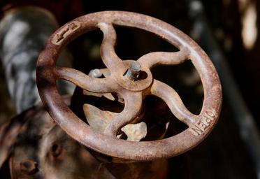 Keywords: wheel valve round turn old rusted equipment metal open arrow