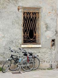 Keywords: wheels wheel cycling bicycles window grid security iron metal wall old ruin