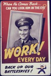 | Keywords: When he comes back... Can you look him in the eye^ Work every day^ Back up our battleskies^ - NARA - 535127.jpg Scope and content General notes 535127 Local identifier 179-WP-1276 Office for Emergency Management War Production Board 01/1942 - 11/03/1945 Still Picture Records Section Special Media Archives Services Division NWCS-S National Archives at College Park 8601 Adelphi Road College Park MD 20740-6001 other date circa 1942 1943 Record group Record Group 179 Records of the War Production Board 1918 - 1947 Record group ARC 508 War Production Board compiled 1942 - 1943 Series ARC 533858 File unit File unit ARC Variant control numbers NAIL Control Number NWDNS-179-WP-1276 Other versions <gallery> File When_he_comes_back _Can_you_look_him_in_the_eye _Work_every_day _Back_up_our_battleskies _-_NARA_-_535127 tif tif File When_he_comes_back _Can_you_look_him_in_the_eye _Work_every_day _Back_up_our_battleskies _-_NARA_-_535127 jpg jpg </gallery> NARA-cooperation PD-USGov World War II posters from the United States |