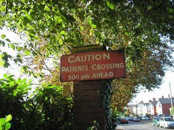 Keywords: Whitchurch Hosptial Sign.jpg 'Patients Crossing' warning sign near the Park Road entrance of Whitchurch Psychiatric Hospital Cardiff Wales 2005-09-27 own assumed Vaughan~commonswiki Whitchurch Hospital Signs in Cardiff