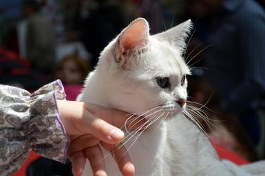 Keywords: white cat fingers hand pet cute feline animal fur kitten domestic kitty soft whiskers adorable cuddly curious expression ears face claws interested loving eyes furry young