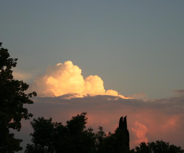 Keywords: white cloud tree silhouette landscape evening sky nature cloudscape dark pink cloud bank reflecting sunlight sunset pinky peachy shades