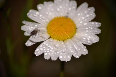Keywords: white daisy flowers fly insect sitting dewdrops wet water petals blossom yellow centre pollen single one still life fleurs floral blooms blooming nature flies