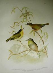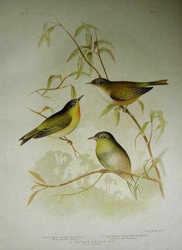 | Keywords: White-eyes.jpg White-eyes 1 Zosterops Albogularis 2 Zosterops Tenuirostris 3 Zosterops Strenuus Hand-colored lithograph PL IX VOL IV by G J Broinowski from The Birds of Australia 1887-1891 http //extinct-website com/extinct-website/product_info php products_id 557 1887-1891 G J Broinowski PD-old Fauna of Lord Howe Island Birds of Australia Zosterops strenuus Zosterops albogularis Zosterops tenuirostris | ||||